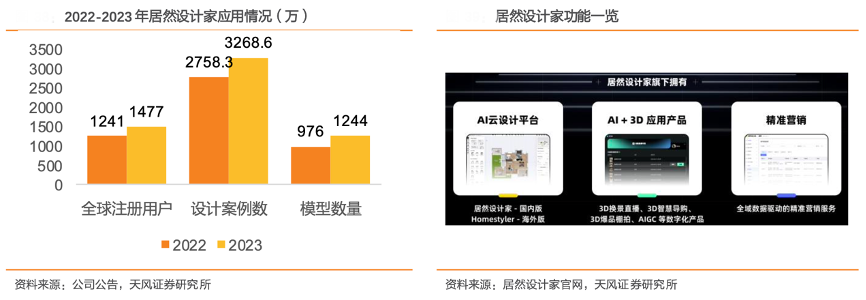 經典案例:根據公司公告、居然設計家官網、天風證券研究所等綜合資訊表明,居然之家居然設計家(原每平每屋設計家)通過 AI、3D、大數據等底層技術 驅動,在致力于為全球家裝設計師和 DIY 客戶提供 AI 設計工具的同時,為泛家居商家提供 換景直播、爆品棚拍、AIGC 等數字化解決方案及精準營銷服務。截至 2023 年年末,居然設計家的全球注冊用戶數量超 1477 萬,同比增長 19%;設計案例數超 3268.6 萬,同比增長 18.5%。