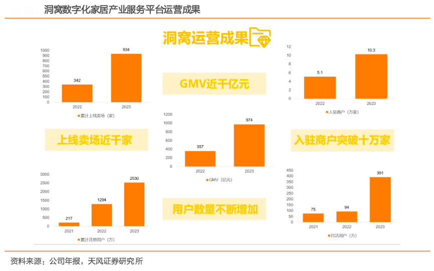 經典案例:根據公司年報、天風證券研究所等綜合資訊表明,洞窩成立于2020 年12月,依托居然之家的產業背景 和平臺資 源打造 ,通過聚焦產業鏈上 下游的 數字化 賦能、線 上線下 一體化 全場景 零售、 跨 境電商三大核心業務,全鏈路賦能品 牌工廠 、經銷 商和賣 場。截至 2023 年底洞窩累計上線賣場已達 934 家,同比增長 173.1%;入駐商戶超過 10 萬家, 同比增長 101.33%。