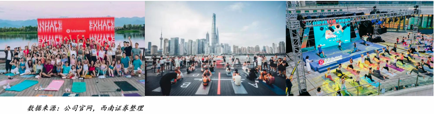 經典案例:根據公司官網、西南證券等綜合資訊表明,有了社群營銷的模式以及educator作為品牌與客戶的紐帶,Lululemon會不定期的舉辦線下集群活動,如“熱汗節”、落日瑜伽、露天瑜伽派對等等,在精準觸達目標客群之后增強客戶粘性 。