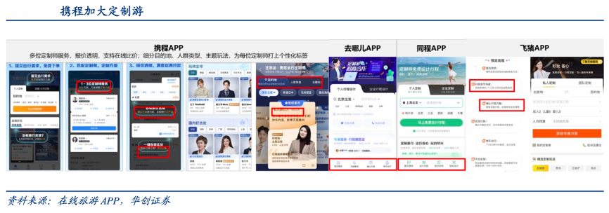 經典案例:根據在線旅游APP、華創證券等綜合資訊表明,2023年攜程私家團 GMV 同比 2019 年增長 370%,其中 2-9 人的小團 GMV 同比 2019 年增長 100%,國內私家團的占比提升了 4 倍(當年底占比已提升到 10%), 海外則提升了 1 倍。相比較下,攜程定制游產品相較其他平臺更為個性化和人性化,依 托完整的大交通和大住宿的旅游生態圈,定制產品有更為明顯的優勢。