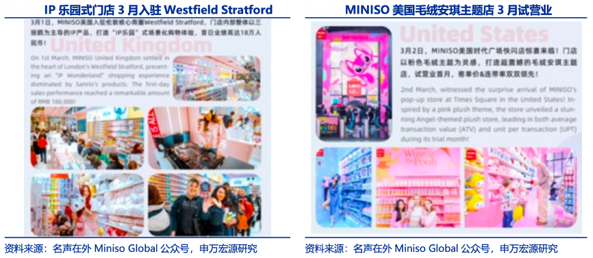 經典案例:根據名聲在外Miniso Global公眾號、申萬宏源研究等綜合資訊表明,名創精心策劃并成功復制 IP 主題店模式,引領當地潮流消費。據贏商網,在美國名創優品打造芭比主題店,引領粉色消費潮流。在印尼 Margo City Store 名創打造全球 首家以三麗鷗為主題的 IP 限定主題店。該店內陳設廣闊的三麗鷗 IP 聯名專區,營造出一個充 滿夢幻童趣的 IP 樂園。