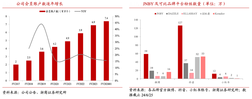 經(jīng)典案例:根據(jù)公司公告、各品牌官方微博、抖音、小紅書帳號、浙商證券研究所等綜合資訊表明,江南布衣通過搭配等增值服務(wù)、售后服務(wù)以及會員福利增強(qiáng)會員粘性,截至 FY2024H1 公司會員賬戶數(shù)量達(dá) 740 萬 個,F(xiàn)Y2017-2023 年復(fù)合增速達(dá) 23%。截止 24/6/25,JNBY 品牌在新興社交平臺微博、抖 音、小紅書上粉絲數(shù)量達(dá) 59、127、12 萬人,顯著領(lǐng)跑其他高端女裝,會員運(yùn)營能力一騎絕塵。