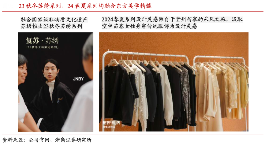 經(jīng)典案例:根據(jù)公司官網(wǎng)、浙商證券研究所等綜合資訊表明,江南布衣公司產(chǎn)品設(shè)計不斷從傳統(tǒng)文化中汲取靈感,在設(shè)計上融合東方美學(xué)精髓、傳統(tǒng)工藝和圖案,JNBY 23 秋冬融合國家非物質(zhì)文化遺產(chǎn)推出蘇繡系列,24 春夏系列融合空申苗寨女性傳統(tǒng)服飾,彰顯出獨(dú)特設(shè)計風(fēng)格與藝術(shù)氣息。