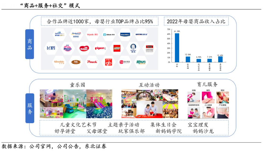 經(jīng)典案例:根據(jù)公司官網(wǎng)、公司公告、東北證券等綜合資訊表明,相對于其他線上平臺,孩子王平臺精準(zhǔn)對焦母嬰群體,縮短商戶與目標(biāo)客群的接觸距離,提高商戶的廣告投入產(chǎn)出效果,入駐商家有望逐漸提升。C 端方面,主要開展涵蓋童樂園、互動活動和育兒服務(wù)的母嬰服務(wù),豐富的社交活動將不斷吸引更多母嬰客戶加入。