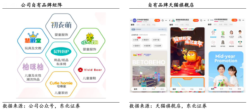 經(jīng)典案例:根據(jù)公司公眾號、天貓旗艦店、東北證券等綜合資訊表明,孩子王根據(jù)現(xiàn)已成功打造七大品牌矩陣,涵蓋用品、玩具、內(nèi)衣家紡、飾品等多個商品品類,為客戶提供豐富的產(chǎn)品解決方案。2022 年自有品牌交易額同比增長 33%。