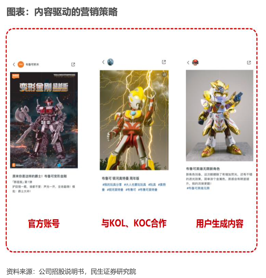經典案例:根據公司招股說明書、民生證券研究院等綜合資訊表明,布魯可采用內容驅動的獨特互聯網營銷策略,消費者參與度高。玩具愛好者積極創作并分享視頻和帖子,這些內容在社交媒體平臺上獲得了數以百萬計的播放量。在2023及2024年內與布魯可合作的KOL 和KOC在2024年3月31日擁有全網粉絲數約1.60億。
