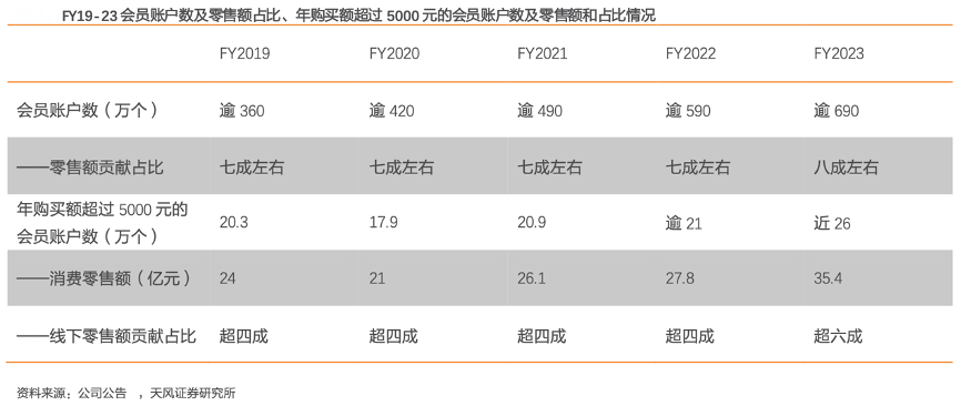 經典案例:根據(jù)公司公告、天風證券研究所等綜合資訊表明,江南布衣精心設計的會員制度提升了消費者體驗,為品牌提供深入的市場洞察。FY19-23,公司會員賬戶數(shù)由逾 360 萬個 增長到逾 690 萬個,零售額貢獻占比增長至八成左右;年購買額超過 5000 元的會員賬戶 數(shù)由 20.3 萬個增長到近 26 萬個,這部分客戶的消費零售額由 24 億元增長至 35.4 億元 (CAGR10.2%),線下零售額貢獻占比超過六成。