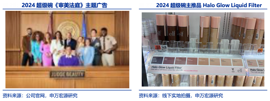經典案例:根據公司官網、線下實地拍攝、申萬宏源研究等綜合資訊表明,傳統媒介上,E.L.F. BEAUTY 選擇美妝品牌少有涉及的超級碗,打造年度爆品底妝。公司抓住超級 碗帶來的巨大曝光優勢,攜手演員 Jennifer Coolidge 拍攝底妝產品 Power Grip Primer 廣告,取得觀眾的積極響應。2024 年,公司繼續沿用超級碗流量,以審美法庭(Judge Beauty) 作為主題,邀請演員 Gina Torres、Rick Hoffman、Sarah Rafferty 等多位明星,打造 Halo Glow Liquid Filter 爆品。