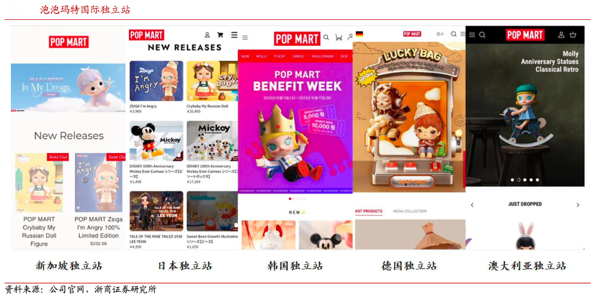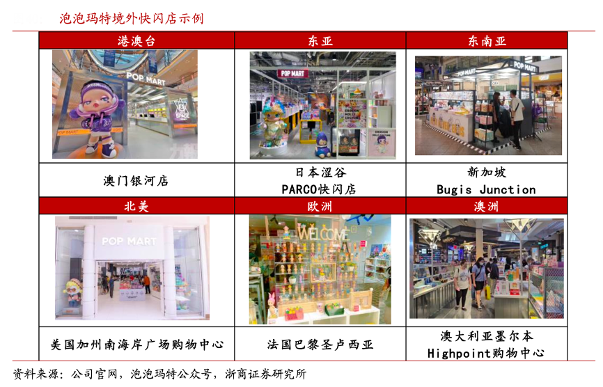 經典案例:根據公司官網、泡泡瑪特公眾號、浙商證券研究所等綜合資訊表明,機器人商店及快閃店初始投資較小、鋪設較快,是增加品牌曝光以及測試銷售數據的最優形式。以日本為例,2020 年 8 月開設第一家機器人商店,2021 年 10 月,東京澀谷 Parco 快閃店和東京 Shibuya-ku 快閃店開業;直至 2022 年 7 月,日本首店于東京澀谷開業。