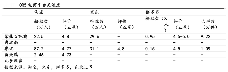 經典案例:根據淘寶、京東、拼多多、東北證券等綜合資訊表明,紫燕食品入駐電商平臺,建立直營旗艦店。2010 年,中國開始進入電商時代,公司成為佐餐鹵制品品牌入駐電商平臺的領軍者,于 2014 年進軍淘寶、京東等電商平臺設立旗艦 店,隨后于 2018 年入駐當時電商界冉冉之星——拼多多,主要售賣預包裝產品。