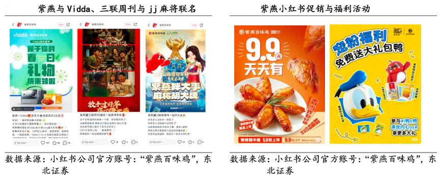 經典案例:根據小紅書公司官方帳號:“紫燕百味雞”、東北證券等綜合資訊表明,紫燕食品公司在社交媒體營銷方面逐漸成熟且有著絕對的領先,而年輕群體在社交媒體用戶占多數,有助于公司在該群體打開知名度,穩定未來客源。 為了進一步推動品牌宣傳,公司與 Vidda、jj 麻將、三聯周刊等第三方品牌聯名合作,同時參與直播賣貨,在線上平臺進行各大促銷與福利活動。