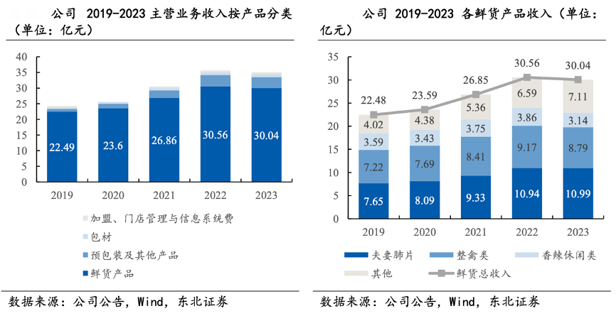 經典案例:根據公司公告、wind、東北證券等綜合資訊表明,紫燕食品公司以塑造“大單品”與“爆品”為目標,推出多種新品,如:酸湯肥牛、冷吃千層肚、樂山缽缽雞、藤椒板鴨等。鮮貨產品的 2019/2020/2021/2022/2023 年的營業收入為 22.49/23.60/26.86/30.56/ 30.04 億 元,CAGR 為+7.52%,由 22.49 億元漲至 30.04 億元,上漲幅度基本與公司主營收入 呈正比。