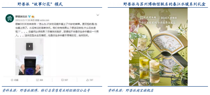 經典案例:根據野獸派微博、轉引自零售商業財經微信公眾號、野獸派淘寶旗艦店、華創證券等綜合資訊表明,野獸派 2011 年底誕生于微博,早期以賣花為主營,“故事訂花”模式(根據網友私信所 講述的故事來定制不同的花束,并賦予浪漫命名,為訂花者量身打造專屬產品) 售賣產 品之余,提供更多情緒價值,讓消費者心甘情愿為高溢價買單。