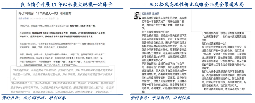 經典案例:根據南方都市報、子彈財經、華創證券等綜合資訊表明,零食量販催生的新一輪供應鏈革命,從下游延伸至上游,過去零食電商時代積累品牌高度,當前從白牌到自建產能優化供應鏈,放大制造效率和性價比優勢。以良品降價為標志,松鼠布局高端性價比、百草味強化“品價比”,零食全渠道開始問供應鏈拿效率,當前也在積極的折扣化摸索中。