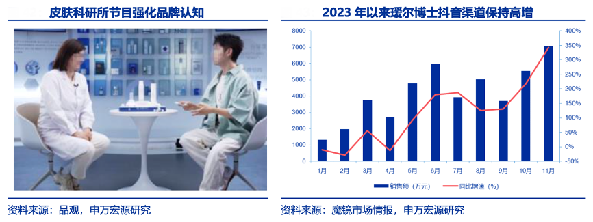 經(jīng)典案例:根據(jù)品觀、魔鏡市場情報、申萬宏源研究等綜合資訊表明,在微生態(tài)護膚的心智搭建上,璦爾博士在《皮膚的真相》《專家請指教》 《皮膚科研所》系列短視頻中,邀請上海市皮膚病醫(yī)院專家鄒穎、重慶醫(yī)科大學附屬第一 醫(yī)院皮膚陳瑾教授、知名 KOL 楊若天、璦爾博士首席研發(fā)師李燕等專家、科研人員走到臺 前,直面消費者需求,實現(xiàn)營銷和科普的“跨界融合”。在專家+達人的 線上營銷體系下,自 2023 年下半年開始,璦爾博士抖音渠道銷售額連續(xù)保持三位數(shù)高速增 長。