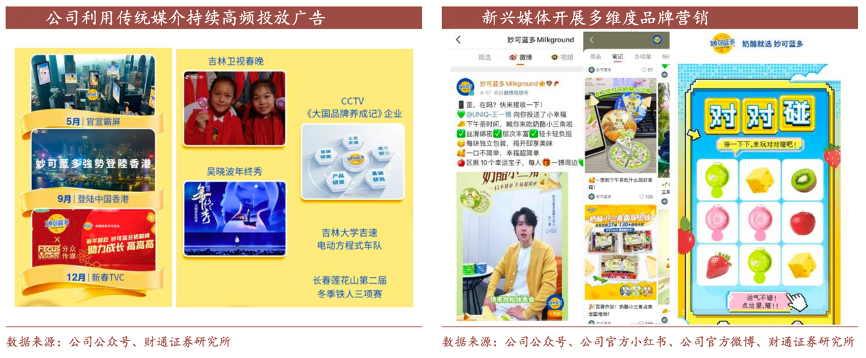 經(jīng)典案例:根據(jù)公司公眾號、公司官方小紅書、公司官方微博、財通證券研究所等綜合資訊表明,妙可藍多公司早期采取“高舉高打”營銷策略,憑借快速、精準、高頻的打法讓“奶酪就選妙可藍多”的品牌價值訴求深入人心。新興媒體方面,公司利用小紅書、抖音、 微博等社交媒體平臺發(fā)布多維場景化內(nèi)容,并與網(wǎng)絡達人合作開展品牌宣傳、與 消費者積極互動,鞏固品牌認知。
