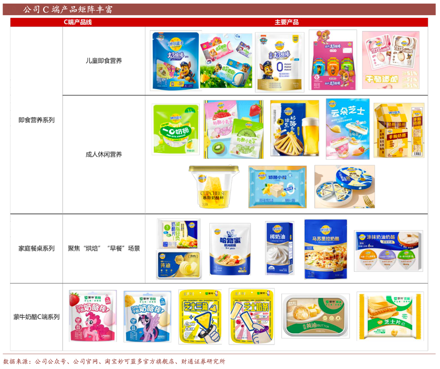 經(jīng)典案例:根據(jù)公司公眾號、公司官網(wǎng)、淘寶妙可藍多官方旗艦店、財通證券研究所等綜合資訊表明,妙可藍多公司堅定推行“聚焦奶酪”戰(zhàn)略,以消費者為導 向持續(xù)完善奶酪產(chǎn)品矩陣,現(xiàn)已構(gòu)建包括即食營養(yǎng)系列(可細分為兒童營養(yǎng)系列、 成人休閑營養(yǎng)系列)、家庭餐桌系列在內(nèi)的 C 端產(chǎn)品線。2024 年,公司即食 營養(yǎng)系列收入貢獻達 54.56%,毛利率達 46.97%,表現(xiàn)相對優(yōu)于家庭餐桌系列。