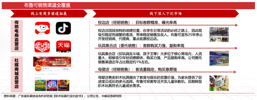經(jīng)典案例:根據(jù)廣東省玩具協(xié)會&灼識咨詢《積木玩具行業(yè)白皮書》、公司公告、中郵證券研究所等綜合資訊表明,布魯可線上直營收入約占整體收入7%,未來線上仍以做私域為主,慮以旗艦店的形式開啟線下自營模式。