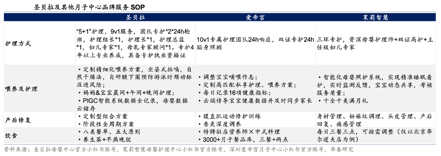 經典案例:根據圣貝拉母嬰中心官方小紅書帳號、茉莉智慧母嬰護理中心小紅薯書官方帳號、深圳愛帝宮月子中心小紅書官方帳號、華泰研究等綜合資訊表明,圣貝拉在完成場景與人員重塑后,服務落地作為供 應鏈重塑的最終環節,其標準化程度直接決定體驗質量。其目前所有月子中心均全面部署該體系,覆蓋業務全流程——包括分工機制、母嬰護理程序及營銷服務等,確保服務質量的一致性。以圣貝拉為例,其采用 24 小時 1V1 專護 保險級護理,配備 9V1 服務團隊,精細化和專業化程度顯著優于傳統護理模式。