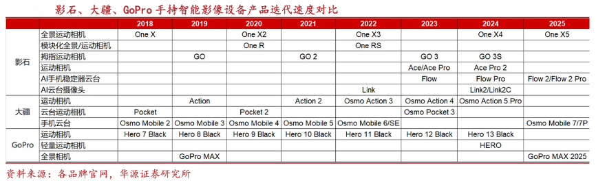 經(jīng)典案例:根據(jù)各品牌官網(wǎng)、華源證券研究所等綜合資訊表明,影石不僅在功能創(chuàng)新方面引領(lǐng)行業(yè),產(chǎn)品線迭代速度同樣領(lǐng)先市場。影石年均推出 3-5 款核 心產(chǎn)品,23/24/25H1 分別更新 3/5/2 款,迭代速度領(lǐng)先友商。同時,新品推出后可以高效轉(zhuǎn) 化為當(dāng)年及次年的收入,持續(xù)貢獻(xiàn)收入增長動力。