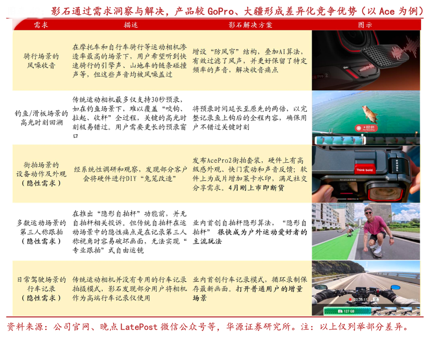 經(jīng)典案例:根據(jù)公司官網(wǎng)、晚點(diǎn)LatePost微信公眾號等、華源證券研究所等綜合資訊表明,復(fù)盤影石產(chǎn)品發(fā)展歷程,公司創(chuàng)新的推出了一系列實(shí)用功能,滿足了全景/運(yùn)動相機(jī)不同場景的細(xì)分需求。如 “隱形自拍桿”:為了防止自 拍桿破壞畫面,公司創(chuàng)新開發(fā)了自拍桿隱形算法,并很快成為行業(yè)主流。