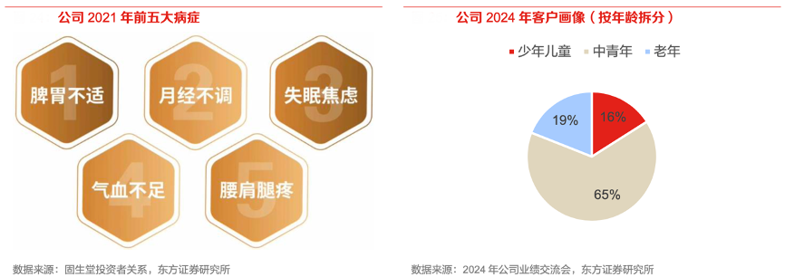 經(jīng)典案例:根據(jù)2024年公司業(yè)績交流會(huì)、固生堂投資者關(guān)系、東方證券研究所等綜合資訊表明,固生堂公司看診病種以常見病、慢性病和亞健康為主,前五大病種分別為:脾胃不適、月經(jīng)不調(diào)、失眠焦慮、氣血不足和腰肩腿疼,需長期復(fù)診。從客戶畫像來看,用戶以中青年為主,消費(fèi)能力和意愿強(qiáng)。
