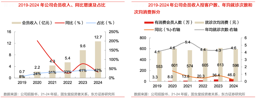 經(jīng)典案例:根據(jù)公司招股書、21-24年報(bào)、固生堂投資者關(guān)系、東方證券研究所等綜合資訊表明,固生堂以會(huì)員體系開拓高頻服務(wù)的增量客戶。公司于 2019 年 3 月推出會(huì)員制度,提供專有服務(wù)、貴細(xì) 藥材和咨詢費(fèi)折扣價(jià)和綠色就診通道,會(huì)員數(shù)量和收入同步快速擴(kuò)大。2019-2024 年會(huì)員收入和 有消費(fèi)會(huì)員數(shù)量 CAGR 分別達(dá)到 76.8%和 69.8%。