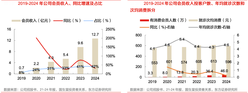 經(jīng)典案例:根據(jù)公司招股書、21-24年報、固生堂投資者關系、東方證券研究所等綜合資訊表明,固生堂公司于 2019 年 3 月推出會員制度,提供專有服務、貴細 藥材和咨詢費折扣價和綠色就診通道,會員數(shù)量和收入同步快速擴大。2019-2024 年會員收入和 有消費會員數(shù)量 CAGR 分別達到 76.8%和 69.8%。