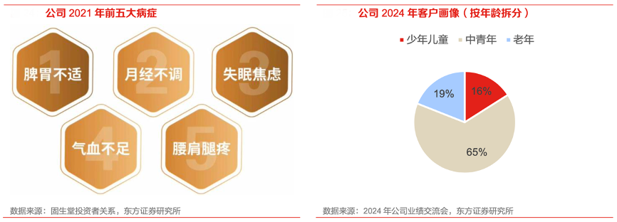 經(jīng)典案例:根據(jù)固生堂投資者關系、2024年公司業(yè)績交流會、東方證券研究所等綜合資訊表明,固生堂公司看診病種以常見病、慢性病和亞健康為主,前五大病種分別為:脾胃不適、月經(jīng)不調(diào)、失眠焦慮、氣血不足和腰肩腿疼,需長期復診。從客戶畫像來看,用戶以中青年為主,消費能力和意愿強。因此,公司業(yè)務消費屬性突出,收入并不依賴醫(yī)保(22 年醫(yī)保收入占比僅 28.8%)。