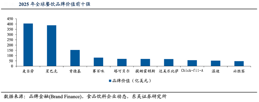 經典案例:根據品牌金融(Brand Finance)、食品飲料企業動態、東吳證券研究所等綜合資訊表明,比薩本為“舶來品”,達美樂具備國際品牌調性,開拓下沉市場具備天然優勢,有望承接低線城市的改善需求:2025 年全球餐飲品牌價值排行榜中,達美樂憑 66.91 億美元的品牌價值位居第七,為比薩品類第一。