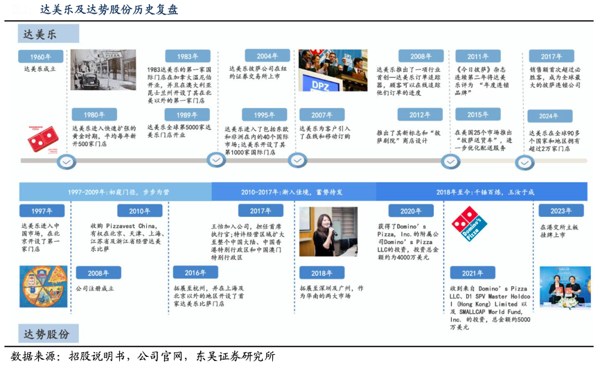 經典案例:根據招股說明書、公司官網、東吳證券研究所等綜合資訊表明,2018 年 8 月、11 月達美樂公司成功擴張至深圳及廣州,標志著全國化布局取得重大突破。由點及面、精耕細作,2023 年公司于香港成功上市,截至 2024 年底,公司門店已成功擴展至 39 個城市,門店總數達 1008 家。