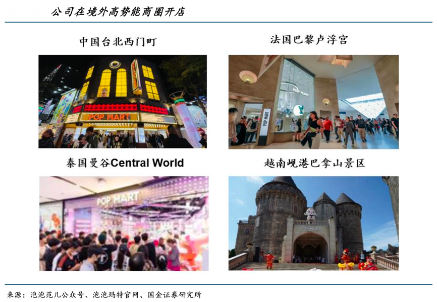 經典案例:根據泡泡瑪特官網、泡泡范兒公眾號、國金證券研究所等綜合資訊表明,2023 年 5 月泡泡瑪特海外首家古堡主題店巴拿山樂園古堡主題店在越南峴港盛大開業,位于目前越南客流量最大的主題公園;2024年品牌勢能 躍遷,向歐洲拓展 7 月泡泡瑪特盧浮宮店在 CARROUSEL DU LOUVRE 正式開業,距離博物館 次入口和倒玻璃金字塔僅僅幾步之遙,成為首個成功進駐盧浮宮的中國潮玩品牌。