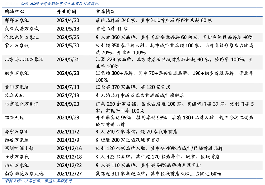 經典案例:根據公司官網、國盛證券研究所等綜合資訊表明,華潤萬象生活多年經營積累大量商戶資源打造“首店經濟”,新開業購物中心開業率超 90%。其2024年上半年開業的 7 座購物中心,綜合開業率均超 90%,首進品牌數量占比超 20%,開業后成為城市消費新地標。